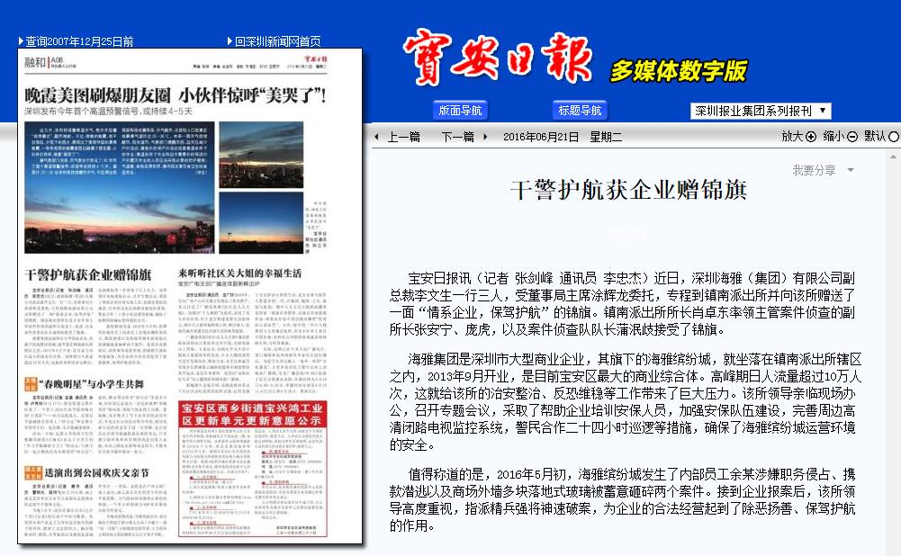 海雅集团是深圳市大型商业企业,其旗下的海雅缤纷城,就坐落在镇南派出所辖区之内,2013年9月开业,是目前宝安区最大的商业综合体。高峰期日人流量超过10万人次,这就给该所的治安整治、反恐维稳等工作带来了巨大压力。该所领导亲临现场办公,召开专题会议,采取了帮助企业培训安保人员,加强安保队伍建设,完善周边高清闭路电视监控系统,警民合作二十四小时巡逻等措施,确保了海雅缤纷城运营环境的安全。