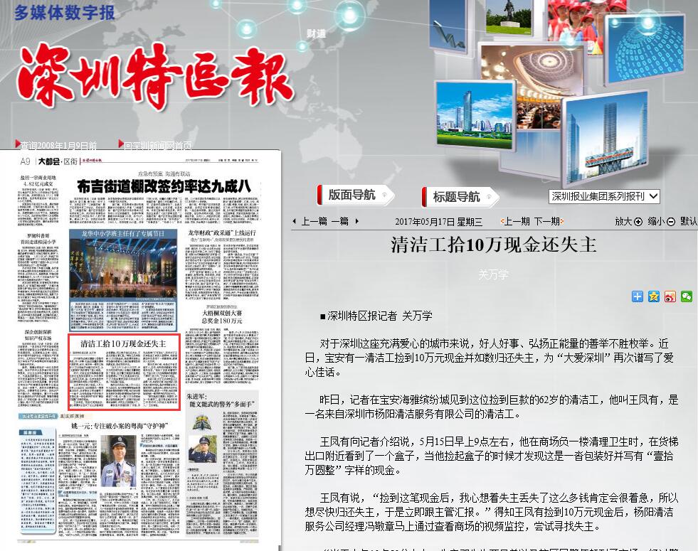 对于深圳这座充满爱心的城市来说,好人好事、弘扬正能量的善举不胜枚举。近日,宝安有一清洁工捡到10万元现金并如数归还失主,为“大爱深圳”再次谱写了爱心佳话。