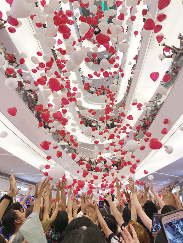 七夕当天,五楼侧厅已提前挂上纱网,铺上了数千只红白气球。从一楼侧厅往上看,仿佛铺成了悬空的云朵。在活动开始前半小时,各楼层和一楼空降位置已经开始围满了众多翘首以盼的顾客,大家都在期待本次“深圳首家空降气球雨”活动。8点一刻,胡桃里的驻唱歌手准时开唱凝聚人气,吸引了更多顾客循声前来。一曲唱完,数千气球应声而落,人群中不断传出赞叹和惊呼声,大家都在为这空降的浪漫情境而欢呼!气球降落期间更响起此起彼伏的拍照声,大家都用手机记录下缤纷城给他们准备的这份“浪漫”,并向身边的朋友、亲人进行二次、三次的传播,形成了良好的“刷屏”传播效应。千只气球下落后,更有许多顾客抢到本次随气球派发的惊喜礼券,兴高采烈地前往客服台兑领自己的奖品。看着每一张笑颜,仿佛都抒写了对此次七夕活动的喜爱与回味。