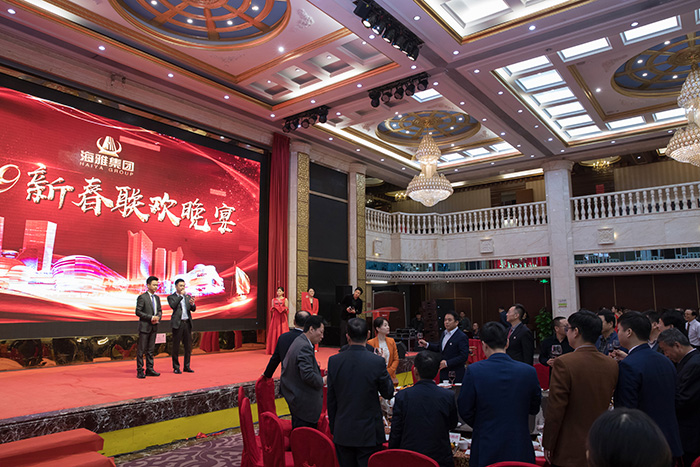 晚会结束后,集团领导和全体员工来到海雅宴会厅参加迎新春晚宴,宴会厅大屏幕上放的集团总部及各分公司的拜年视频,让会场洋溢着浓浓的年味。