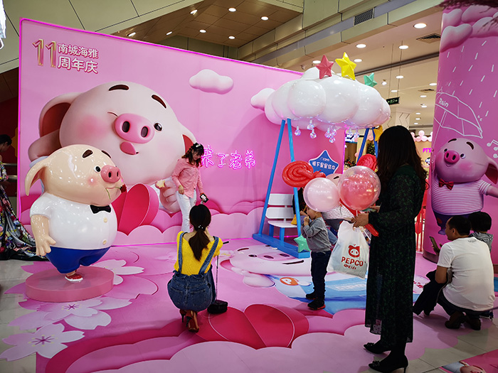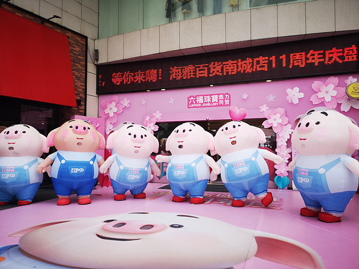 芳菲四月天,海雅百货南城店11周年庆在一片期待中盛大开幕,走进商场大门是憨态可掬的卡通网红“猪小屁”笑脸欢迎着来自四面八方的宾客,店内是热情洋溢的员工在推介店庆的各种福利,顾客在满场粉色的氛围中感受着浓墨重彩的节日喜悦。
