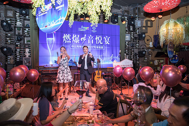 随后胡桃里乐队用精彩的歌曲串烧将当晚气氛带到了高潮,献上《一生所爱》、《红日》等多首专门为香港业主准备的粤语歌曲,业主们兴奋的随着音乐摇动手机的闪光灯,现场星光点点,仿佛亲临演唱会的现场。不知不觉间活动已接近尾声,销售将客户引导到缤纷城一楼沙盘区,大家合影留念后前往附近的酒店休息。
