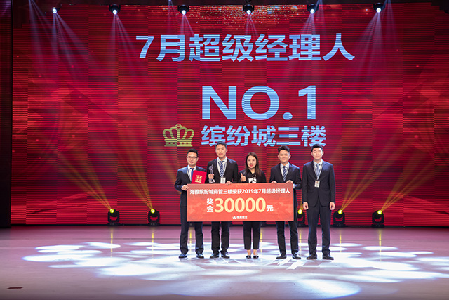 伴随着热烈的掌声,南山店总经理苏俐莉首先宣布了商业公司2019年7月的超级经理人考核结果:获奖团队为海雅缤纷城三楼团队。海雅缤纷城三楼团队已是第二次获此殊荣,这也印证了努力将得到最好的回馈的经验。苏总为获奖团队颁发了证书、奖杯与30000元奖金,并合影留念。