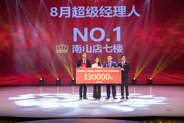 随后,东城店总经理于怡揭晓了商业公司2019年8月的超级经理人为海雅南山店七楼团队,并为获奖团队颁发了证书、奖杯与30000元奖金及合影留念。苏总上台为南山店的获奖致辞。苏总讲到:此次荣获奖项,南山店心存感恩;在南山店面对施工围堵、商圈竞争激烈、供应商的合作压力等经营困难时,南山店商管团队没有灰心与消极,仍砥砺前行;在商业总经理尔帆总的指导下,逐渐实现数据化管理,以利润为导向,进行楼层的自主经营;商管全员参与经营,清晰分工,以保姆制管理进行点对点的品牌服务,不断地相互学习、激励进步。随着地铁开通日期的靠近,还需要南山店不断改革升级,不断引进创新的思路和产品,提高精细化管理能力;愿海雅集团不断创造出全新的辉煌篇章。