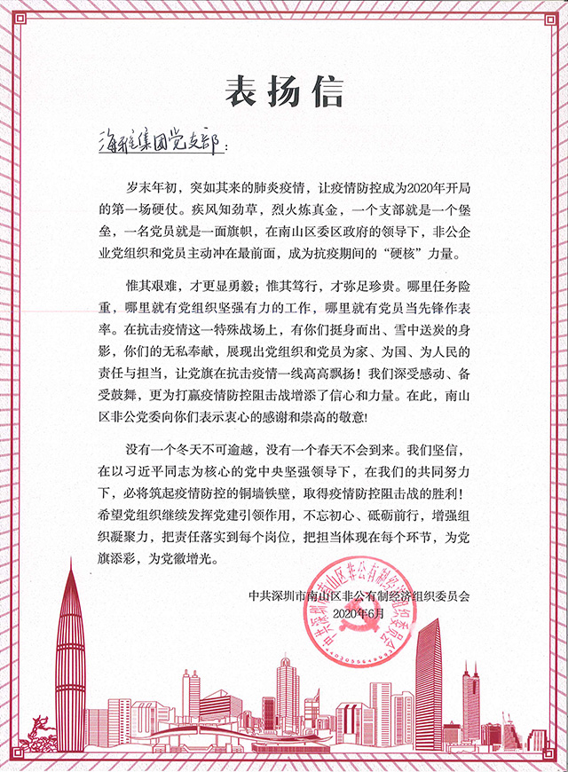据悉,收到本次表扬信企业共有六家企业,分别为海能达党委、海王集团党委、乐信党总支、海雅集团支部、粤美特党支部、金阳盛党支部。