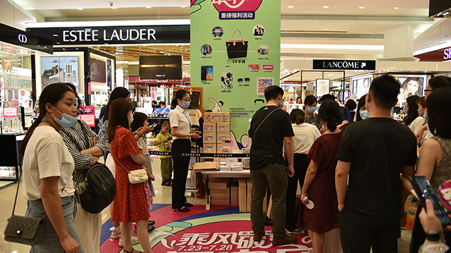 7月23日至7月28日,东城、南城两店的活动如火如荼的进行着。“乘风破浪的姐姐们”是近期网络极火爆的话题性综艺节目之一,结合话题热点,东莞两店以“乘风破浪”为主题来开展本次年中庆活动,其中,我们结合“小姐姐来踢馆”的节目环节开展一场SP活动,根据两店的场地情况分别布置了打卡点,凡通过现场打卡发朋友圈即赠送人均等值的“乱花券”,此活动吸引了一批漂亮的小姐姐来到现场完成打卡,并间接在朋友圈为我们的联庆活动做宣传推广。此外,本次活动尝试各种会员积分的玩法,一方面通过强化会员使用积分的意识,让会员亲身体验到积分带来的便利与实惠,一方面向广大会员输出“积分可当现金使用”的消费方式,减少送券的传统百货形式,不断迭代捆绑会员,全面激活积分的实用性。本次活动在抽奖礼品设置上增加了500积分与10000积分分别作为幸运奖与三等奖礼品,减少了实际采购礼品的费用支出,也通过“获得积分”作为契机让客服中心工作人员不断给顾客讲解积分的用处与好处。同时本次活动的会员到店礼我们也采用赠送5000积分的形式。一系列的积分活动,目的是培养顾客的积分意识,把积分玩转起来,绑定顾客、维系顾客,为门店后期开展专场积分活动奠定基础。