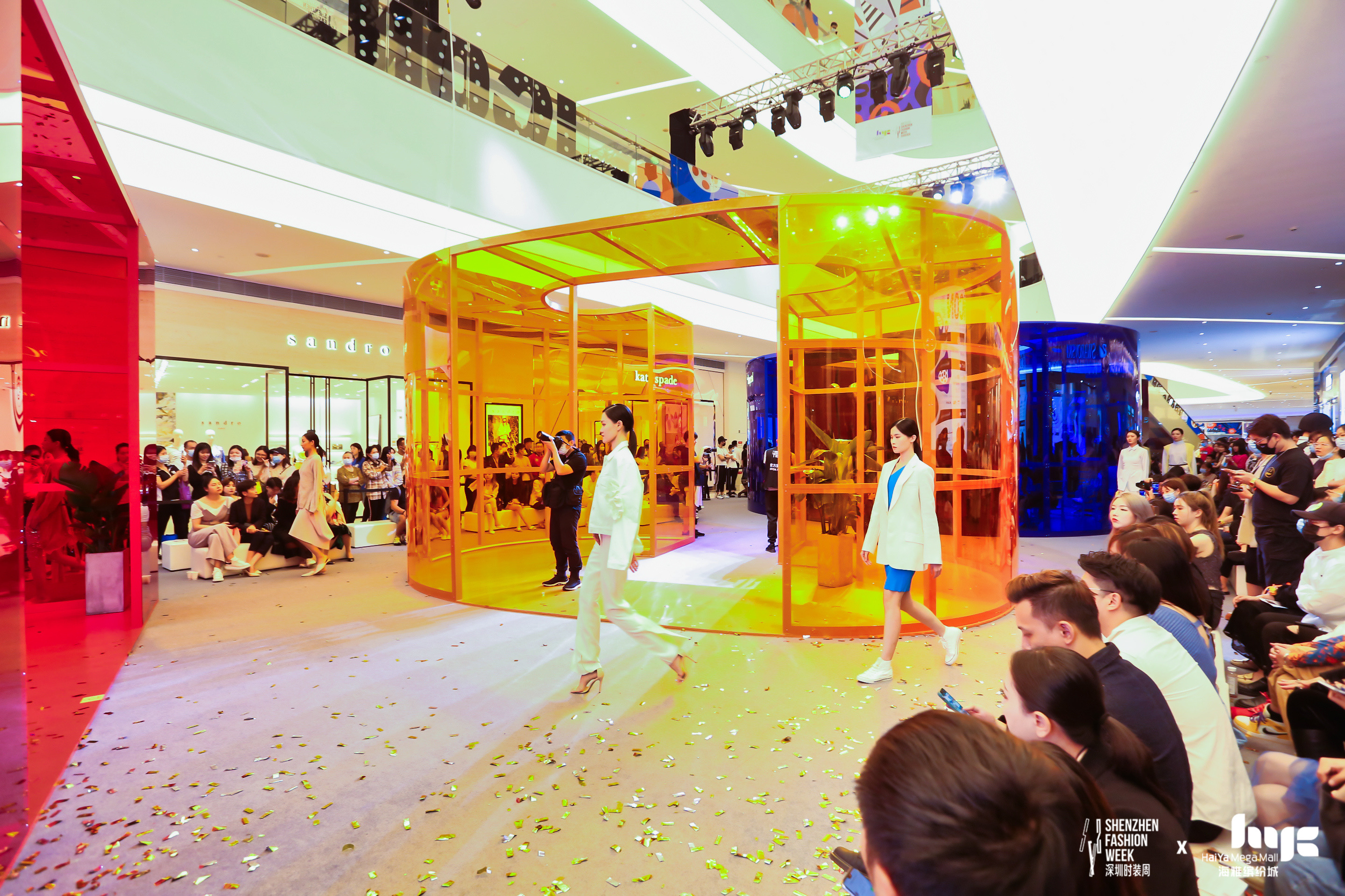 与常规T台不同,海雅缤纷城时装周把秀场和快闪店的场景融合,模特穿梭在字母装置之间动态展示春夏新品服饰,实现了场景创新。快闪店的整体造型为4个透明彩色字母“ICON”组成的幻彩空间,内部作为深圳时装周特邀品牌的陈列空间,Theo VII、OWNLIFE往来、CLARA JACOB克莱雅限时独家开放线下零售快闪店,同时是时尚大秀的走秀现场,光影交错让时装在模特的移动中展示色彩的律动感和设计的前卫感,观众坐落在空间各侧看秀,享受全方位的通透视角。独特的工业风设计和迷幻的色彩空间也让快闪店成为了消费者的打卡热点。