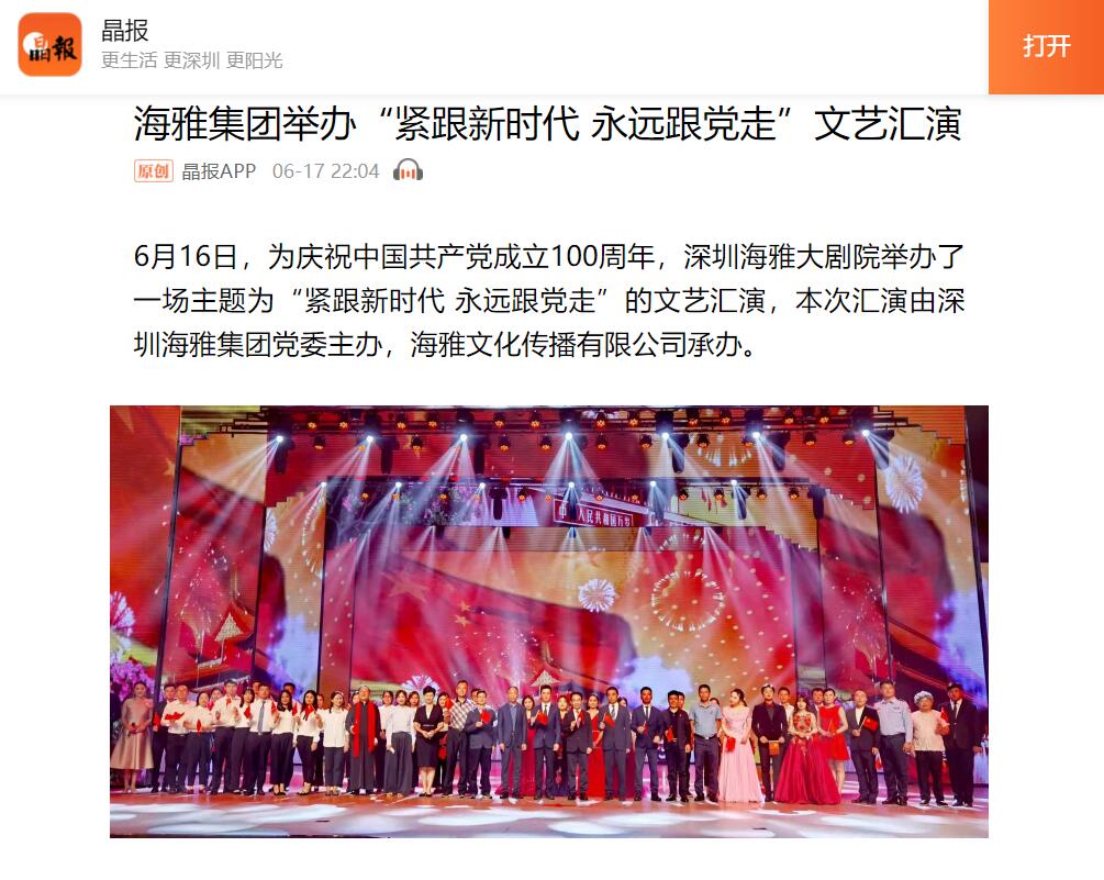 6月16日,为庆祝中国共产党成立100周年,深圳海雅大剧院举办了一场主题为“紧跟新时代 永远跟党走”的文艺汇演,本次汇演由深圳海雅集团党委主办,海雅文化传播有限公司承办。