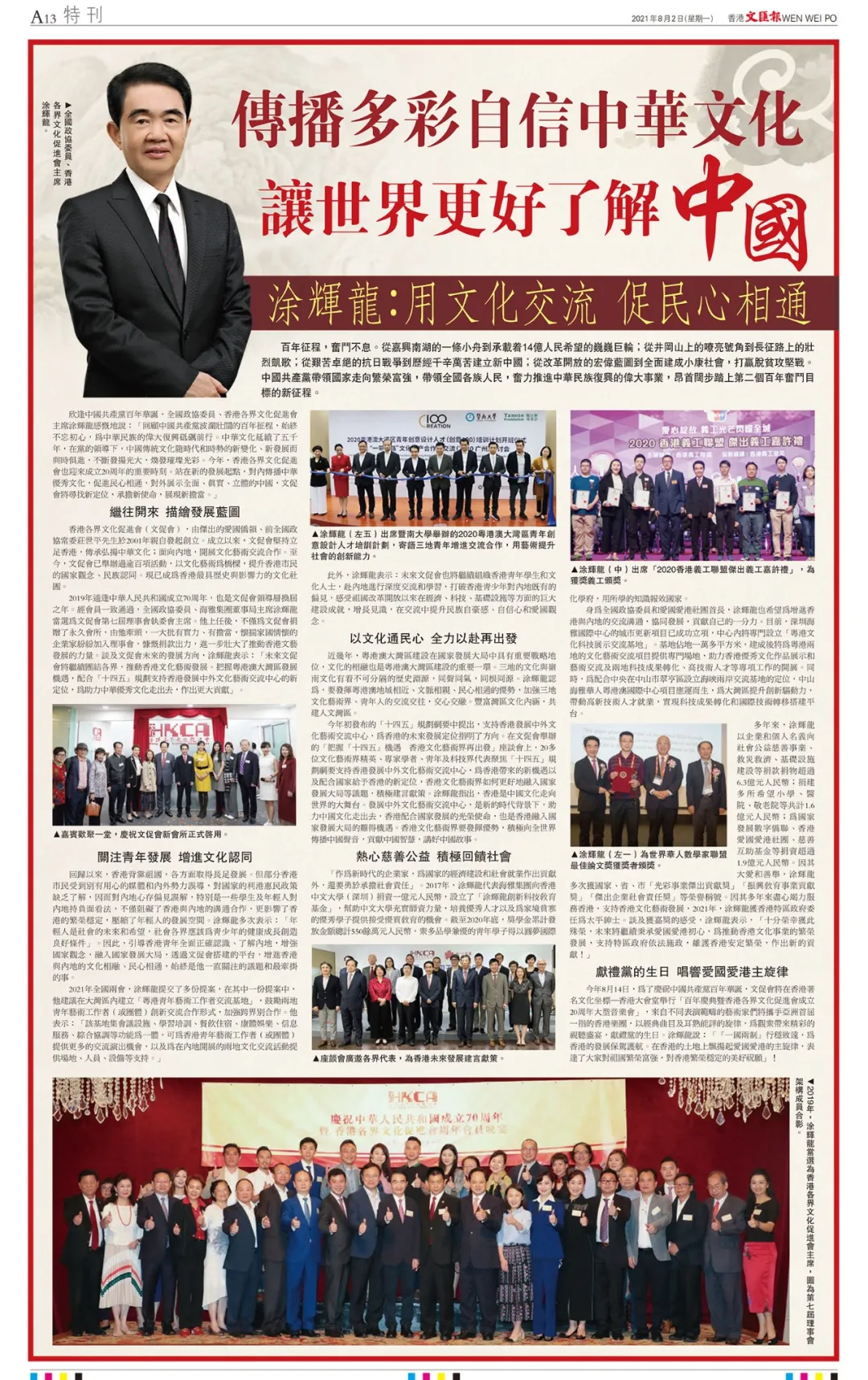 欣逢中国共产党百年华诞,全国政协委员、香港各界文化促进会主席涂辉龙感慨地说:“回顾中国共产党波澜壮阔的百年征程,始终不忘初心,为中华民族的伟大复兴砥砺前行。中华文化延续了五千年,在党的领导下,中国传统文化随时代和时势的新变化、新发展而与时俱进,不断发扬光大,焕发璀璨光彩。今年,香港各界文化促进会也迎来成立20周年的重要时刻。站在新的发展起点,对内传播中华优秀文化,促进民心相通,对外展示全面、真实、立体的中国,文促会将寻找新定位,承担新使命,展现新担当。”