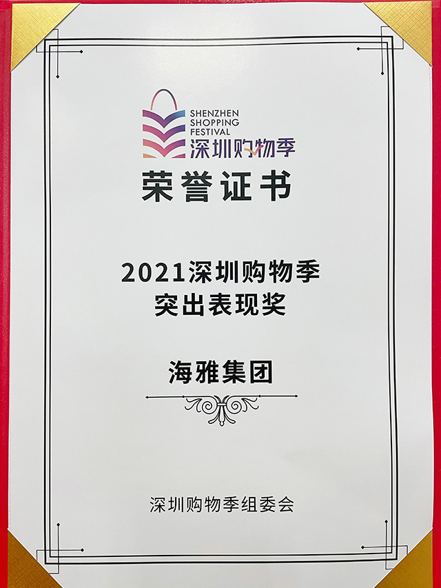 海雅集团凭借雄厚的集团实力和亮眼的行业表现,在由深圳市政府主办的“2021深圳购物季”活动中,荣获“2021年度深圳购物季突出表现奖”。
