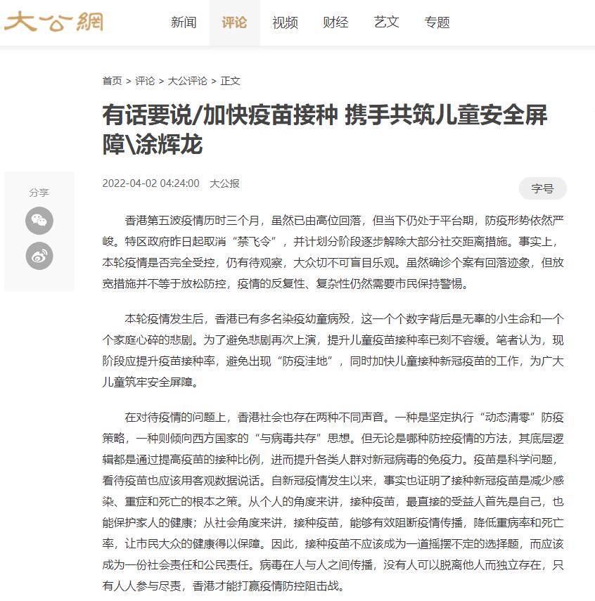 在对待疫情的问题上,香港社会也存在两种不同声音。一种是坚定执行“动态清零”防疫策略,一种则倾向西方国家的“与病毒共存”思想。但无论是哪种防控疫情的方法,其底层逻辑都是通过提高疫苗的接种比例,进而提升各类人群对新冠病毒的免疫力。疫苗是科学问题,看待疫苗也应该用客观数据说话。自新冠疫情发生以来,事实也证明了接种新冠疫苗是减少感染、重症和死亡的根本之策。从个人的角度来讲,接种疫苗,最直接的受益人首先是自己,也能保护家人的健康;从社会角度来讲,接种疫苗,能够有效阻断疫情传播,降低重病率和死亡率,让市民大众的健康得以保障。因此,接种疫苗不应该成为一道摇摆不定的选择题,而应该成为一份社会责任和公民责任。病毒在人与人之间传播,没有人可以脱离他人而独立存在,只有人人参与尽责,香港才能打赢疫情防控阻击战。