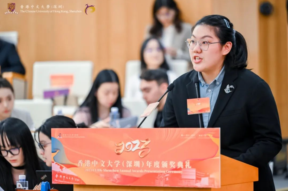 赵卓彦同学向所有获奖同学表示了祝贺。她分享了自己在大学期间的探索和发现,港中大(深圳)灵活的课业安排给了她足够的时间,而学校提供的平台资源更是给予了她机会去发现真正的自我。她的目标是成为一名务实的研究人员,她在发展经济学研究项目中锻炼了定量分析的技能,加深了对中国经济的理解。此外,她还通过实际行动促进更公平的社会,参与新生注册志愿者工作,自愿参加招生工作,并向联合国儿童基金会等机构捐款,支持妇女赋权和农村地区儿童的教育。她表示在香港中文大学(深圳)就读期间有幸向杰出的导师学习,得到了他们的指导和支持。