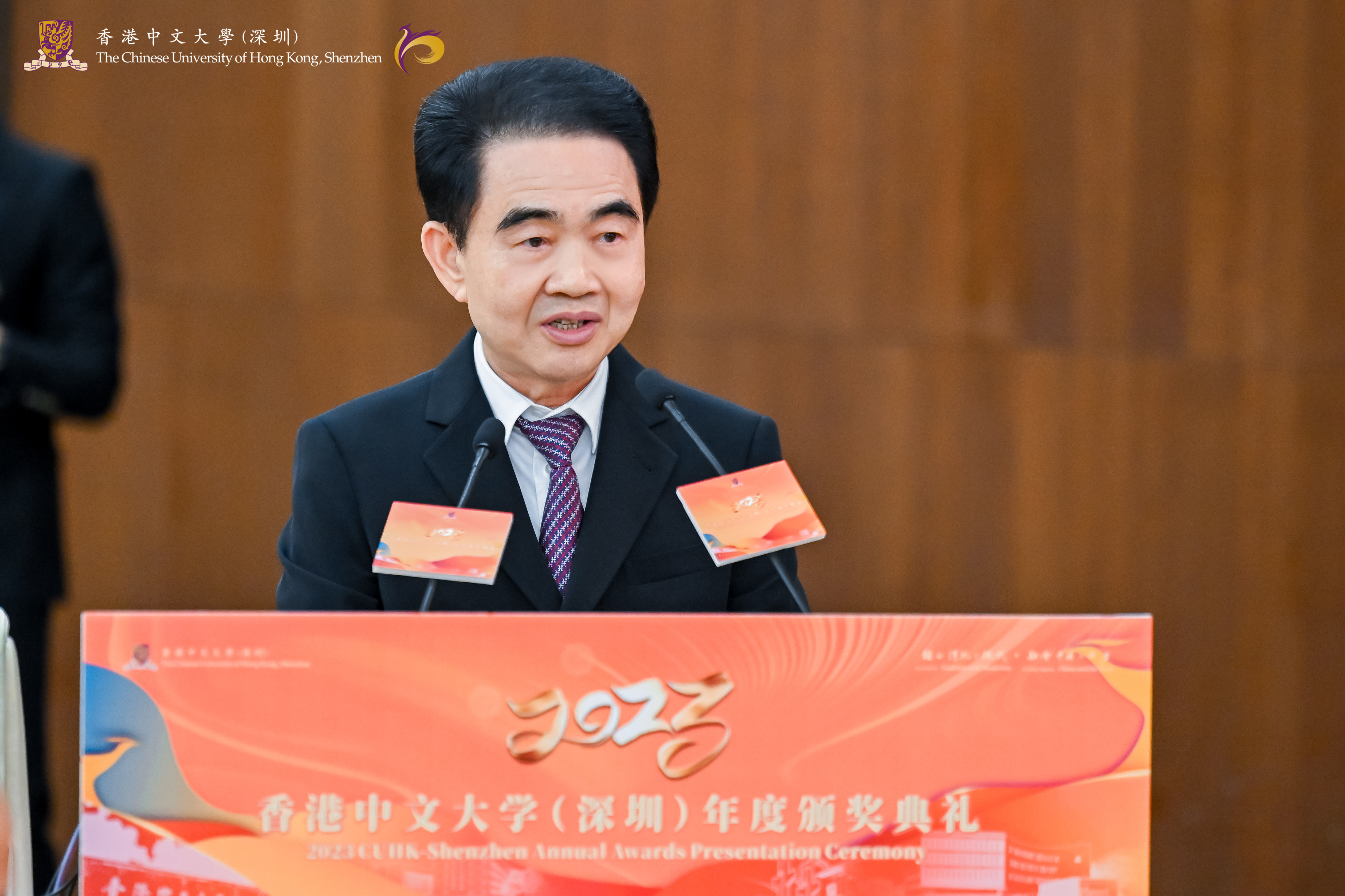 副校长朱世平教授为典礼致辞,他向获奖师生表示由衷的祝贺,他感激每一位学生的不懈努力与教师的无私奉献,认为每位获奖的师生都应当得到最热烈的掌声。他期待着与全体师生一起,共同书写香港中文大学(深圳)更加辉煌的未来。