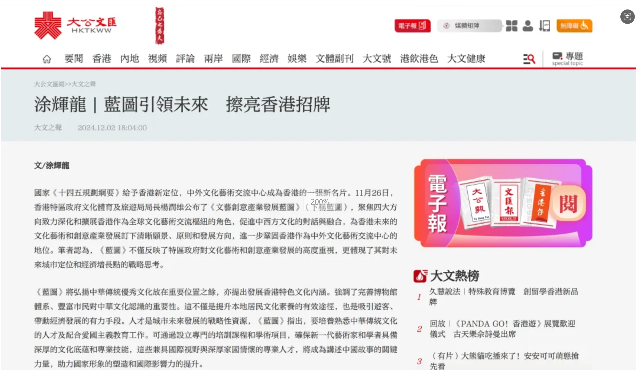 11月26日,香港特区政府文化体育及旅游局局长杨润雄公布了《文艺创意产业发展蓝图》,聚焦四大方向致力深化和扩展香港作为全球文化艺术交流枢纽的角色,促进中西方文化的对话与融合,为香港未来的文化艺术和创意产业发展订下清晰愿景、原则和发展方向。全国政协委员、香港各界文化促进会主席、海雅集团董事局主席涂辉龙博士撰文指出:《蓝图》不仅反映了特区政府对文化艺术和创意产业发展的高度重视,更体现了对未来城市定位和经济增长点的战略思考。有助于进一步巩固香港作为中外文化艺术交流中心的地位,提升中华文化的国际影响力和传播力,讲好中国故事。