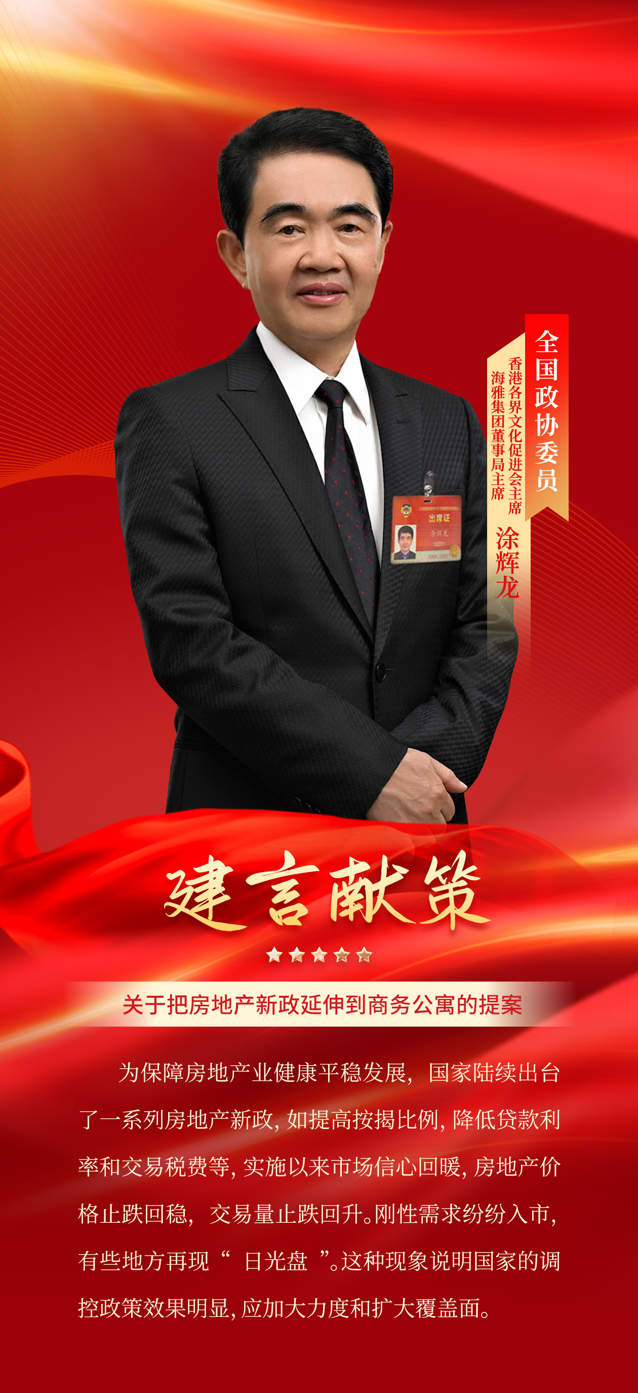 把房地产新政的覆盖范围延伸到商务公寓,使商务公寓与普通住宅享有同样按揭比例和利率、税收等优惠,同时配置入学学位。理由是:商务公寓和普通住宅的居住功能是一样的,无非是针对人群有差别,不应区别对待。当今的年轻人面对各种竞争和高房价,工作和生活压力很大,造成各种焦虑情绪,不敢成家或选择“丁克”的人越来越多,这是一种不好的现象和趋势。商务公寓为年轻人置业提供了比较好的选择,如果减轻首付款和贷款利息的压力,又解决了子女教育问题,会增强年轻人成家立业的积极性,促使他们置业安家,生儿育女,助力国家的长远发展。