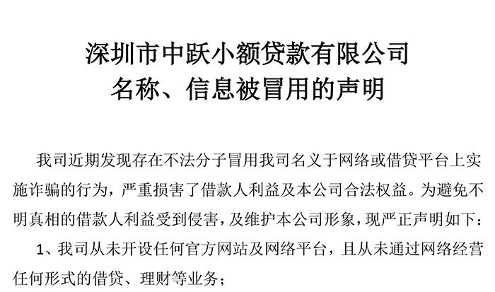 深圳市中跃小额贷款有限公司名称、信息被冒用的声明 2017-10-20